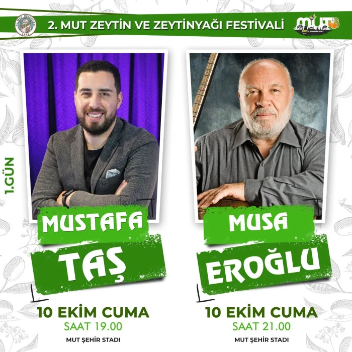 Mut Belediyesi’nin organize ettiği festivalde, Musa Eroğlu, Haluk Levent, Ece Mumay ve Mustafa Taş sahne alacak; zeytinyağlı yemek yarışması, ödüllü şiir yarışması, panel ve çocuk karnavalı renkli görüntülere sahne olacak.