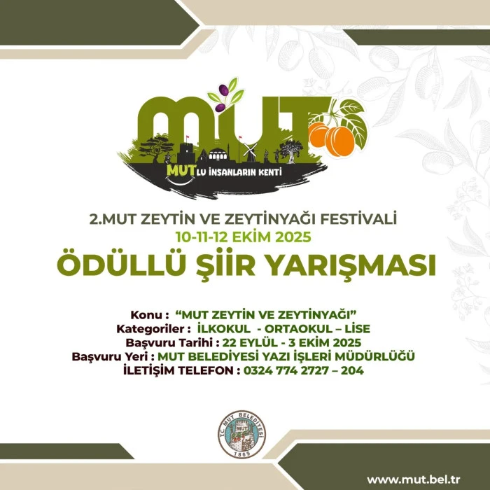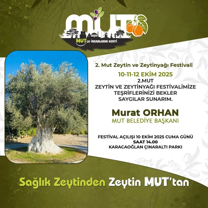 “Zeytin ve zeytinyağımız ilçemizin simgesi, sağlığın ve bereketin kaynağıdır. Bu değerimizi tanıtmak, üreticimize destek olmak için bu yıl ikincisini düzenlediğimiz Mut Zeytin ve Zeytinyağı Festivali’ne tüm hemşehrilerimizi ve misafirlerimizi bekliyoruz.”