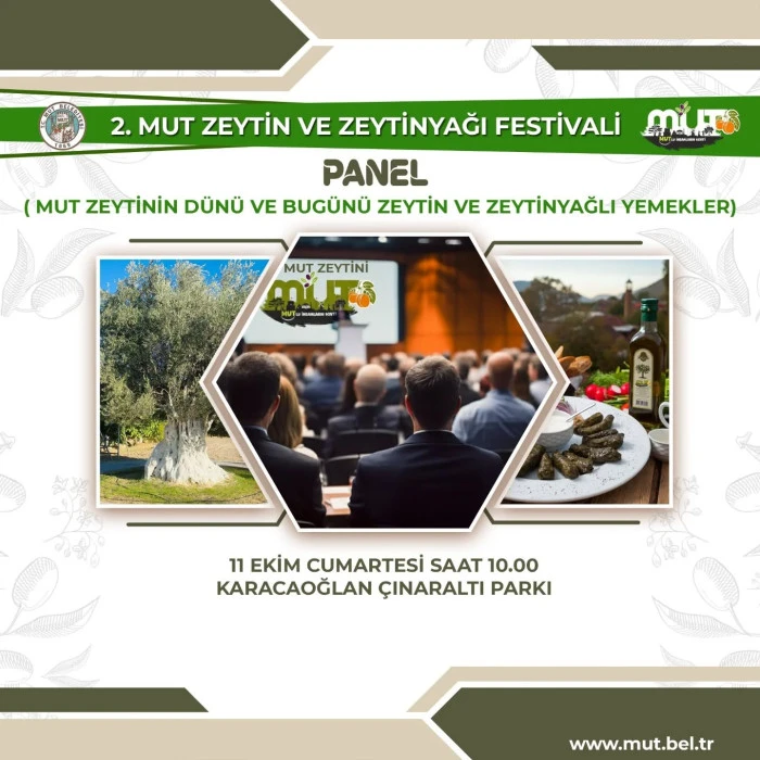 Festival kapsamında ayrıca 11 Ekim Cumartesi günü saat 10.00’da Karacaoğlan Çınaraltı Parkı’nda “Mut Zeytininin Dünü ve Bugünü – Zeytin ve Zeytinyağlı Yemekler” başlıklı bir panel gerçekleştirilecek.