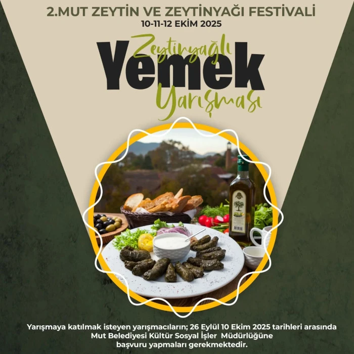 Festivalde geleneksel lezzetlerin öne çıkarılacağı “Zeytinyağlı Yemek Yarışması”, 26 Eylül – 10 Ekim 2025 tarihleri arasında başvuruların alınmasıyla yapılacak. Yarışmacılar, Mut Belediyesi Kültür ve Sosyal İşler Müdürlüğü’ne başvurabilecek.