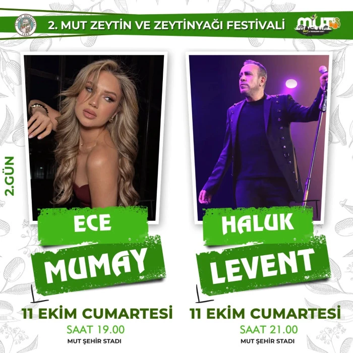 İkinci gün, 11 Ekim Cumartesi akşamı yine Mut Şehir Stadı’nda saat 19.00’da Ece Mumay, saat 21.00’de ise ünlü sanatçı Haluk Levent konser verecek.