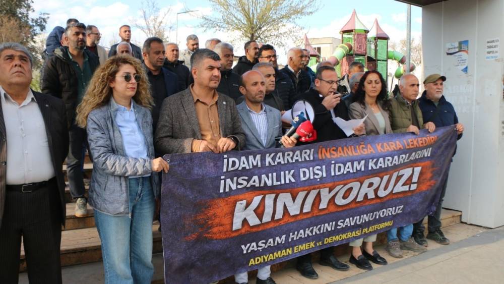 Adıyaman Emek ve Demokrasi Platformu, Mimar Sinan Kültür Parkı Güney Kapısı'nda düzenlediği basın açıklamasıyla İsrail Meclisi'nde kabul edilen ve yalnızca Filistinlilere uygulanması öngörülen idam cezası düzenlemesine tepki gösterdi. Açıklamada, "Kadınları, çocukları, sağlık çalışanlarını ve gazetecileri hedef alan saldırılar dünyanın gözü önünde sürerken uluslararası güvenlik mekanizmaları sessiz kalmaktadır" ifadeleri kullanıldı.