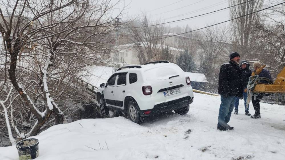 ADIYAMAN (PERRE) - Musa GÜRBÜZ - Adıyaman'da etkili olan kar yağışı nedeniyle kayganlaşan yolda kontrolden çıkan bir otomobil, köprüden uçma tehlikesi atlattı. Araç, köylüler ve İl Özel İdaresi ekiplerinin yardımıyla kurtarıldı.