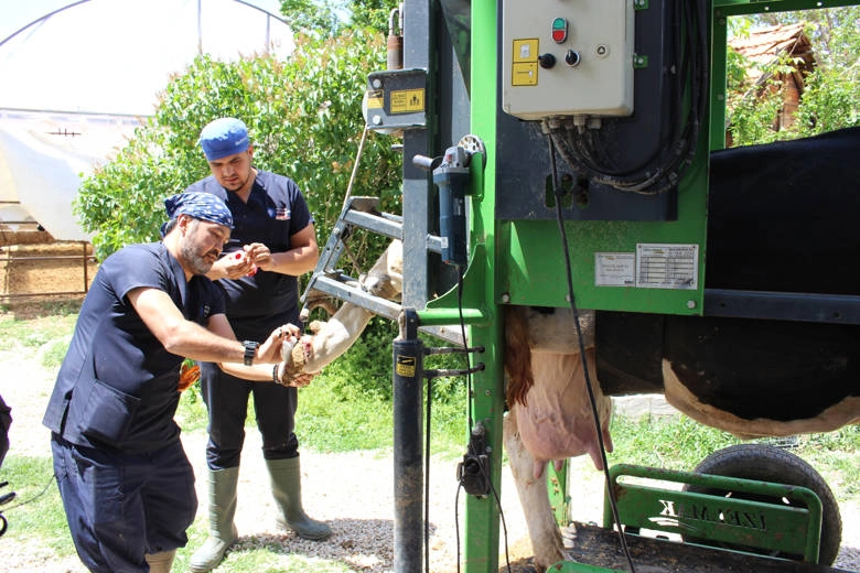 ANTALYA (İGFA) - Yerelden Kalkınma Projesi kapsamında tarım ve hayvancılığa önemli destekler sağlayan Antalya Büyükşehir Belediyesi, büyükbaş hayvancılıkla uğraşan besicilerin daha fazla verim elde etmelerini sağlamak amacıyla hayvanları ücretsiz sağlık kontrolünden geçiriyor. Büyükşehir ekipleri, Elmalı’da hayvancılıkla uğraşan, besicilerin büyükbaş hayvanlarının tırnak bakımlarını da yapıyor.