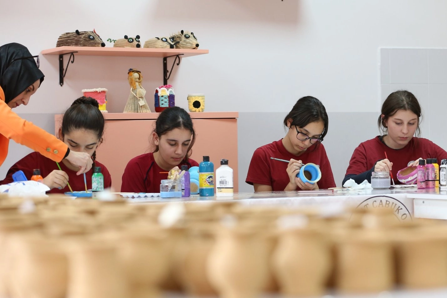 Bursa'nın Osmangazi ilçesinde geleneksel el sanatlarına yönlendirilen yaklaşık 10 bin öğrenci, yaptıkları çömlekleri boyayıp okullarında sergiliyor.