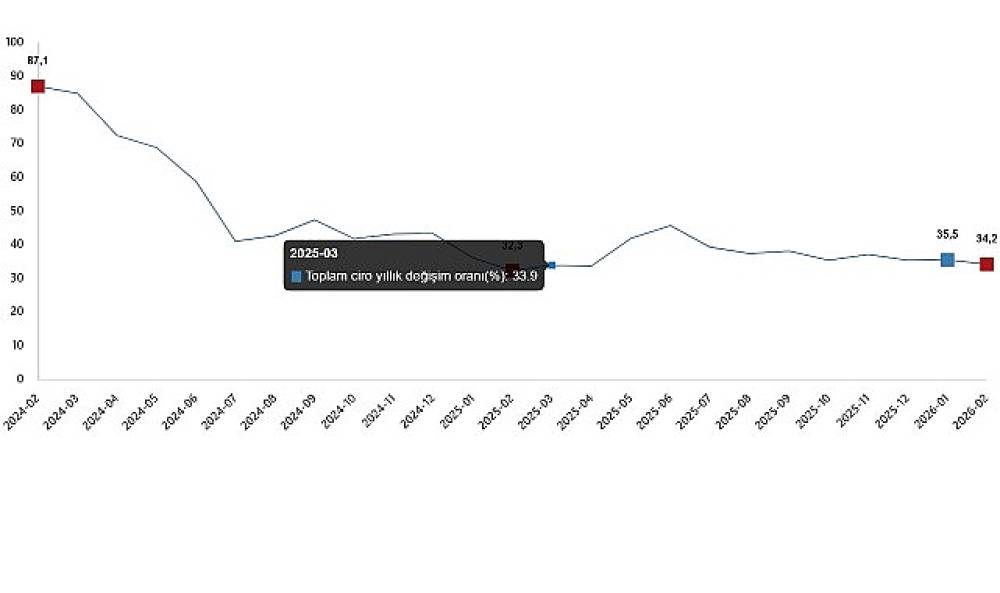 Toplam ciro yıllık %34,2 arttı Sanayi, inşaat, ticaret ve hizmet sektörleri toplamında ciro endeksi (2021=100), 2026 yılı Şubat ayında yıllık %34,2 arttı. Toplam cironun alt detaylarına bakıldığında; 2026 yılı Şubat ayında yıllık sanayi sektörü ciro endeksi %31,7 arttı, inşaat ciro endeksi %20,2 arttı, ticaret ciro endeksi %36,8 arttı, hizmet ciro endeksi %34,6 arttı. Toplam ciro yıllık değişim oranı(%), Şubat 2026 Ciro endeksleri yıllık değişim oranları(%), Şubat 2026 Toplam ciro aylık %2,0 arttı Sanayi, inşaat, ticaret ve hizmet sektörleri toplamında ciro endeksi (2021=100), 2026 yılı Şubat ayında aylık %2,0 arttı. Toplam cironun alt detaylarına bakıldığında; 2026 yılı Şubat ayında aylık sanayi sektörü ciro endeksi %4,1 arttı, inşaat ciro endeksi %3,0 azaldı, ticaret ciro endeksi %1,5 arttı, hizmet ciro endeksi %2,5 arttı. Toplam ciro aylık değişim oranı(%), Şubat 2026 Ciro endeksleri aylık değişim oranları(%), Şubat 2026   Kaynak: (BYZHA) Beyaz Haber Ajansı