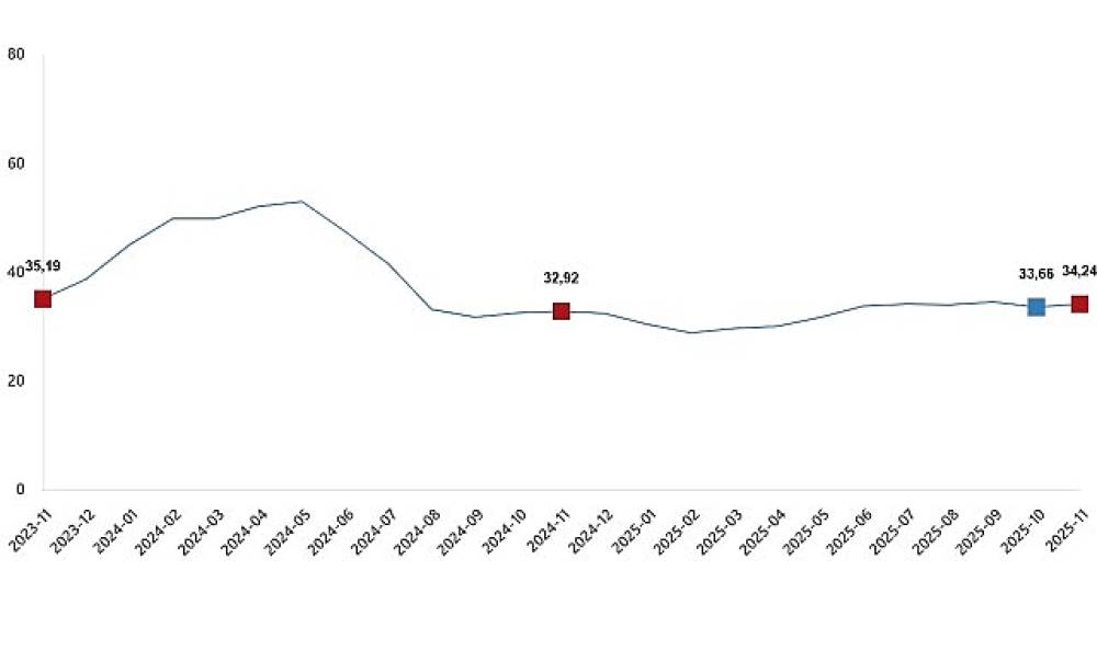 Tarım-GFE'de (2020=100), 2025 yılı Kasım ayında bir önceki aya göre %1,84 artış, bir önceki yılın Aralık ayına göre %31,43 artış, bir önceki yılın aynı ayına göre %34,24 artış ve on iki aylık ortalamalara göre %32,44 artış gerçekleşti.